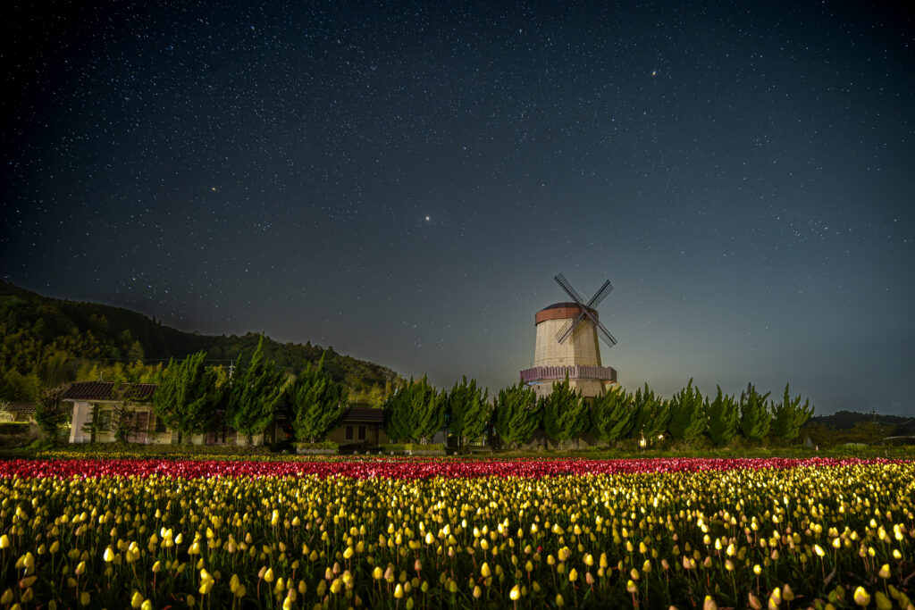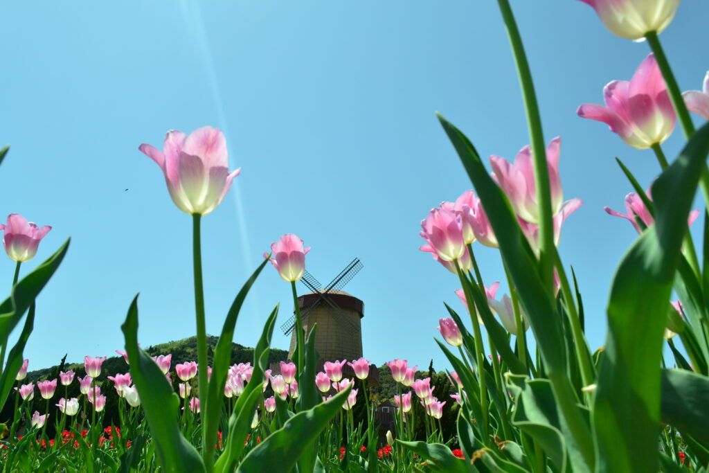 この時期しか見られない、畑一面に広がるチューリップとオランダ風車の風景をお楽しみください♪
