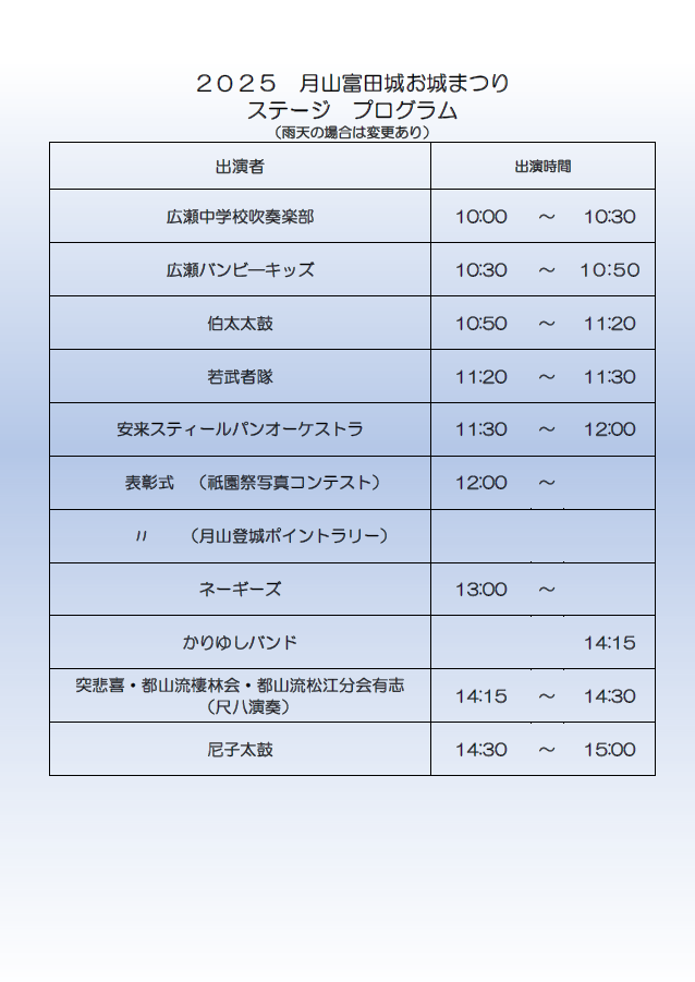 午前の部▷広瀬中学校吹奏楽部、バンビーキッズ、伯太太鼓、広中武者隊(鉄砲隊、なぎなた隊)、安来スティールパンオーケストラ
